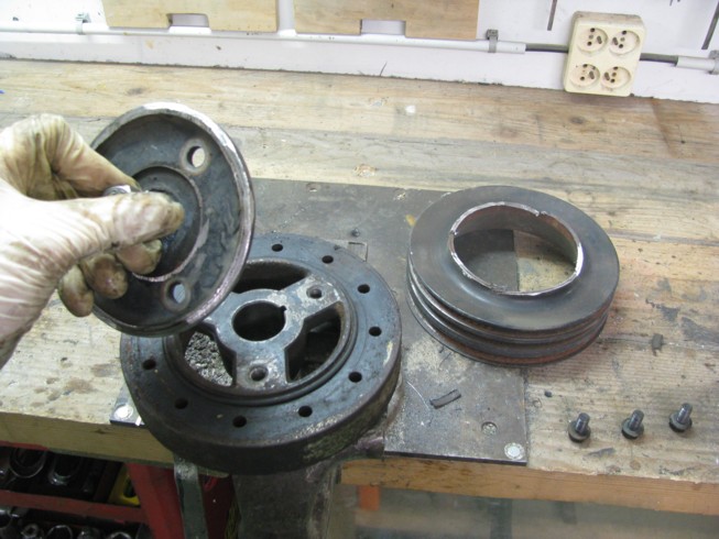 toute les pièces étaient bien propre, j'ai changé la pompe a huile , le joint de carter ( silicone) le joints spi du damper ,, j'ai du me confectionner un arrache damper maison avec une vieille poulie de la Caprice , par contre pour remonter le damper ( cette saloperie est une horreur a remonter , même en chauffant l'axe du damper pour le dilater afin qu'il entre mieux sur l'arbre ; sans outil c'est niet !!!!) j'ai bricolé un truc avec des rondelles et le boulon d'origine pour le rentrer a sa place , tout ca dans l'espace exiguë créé entre la traverse , la crémaillère et le bas moteur , une merde !!!!!